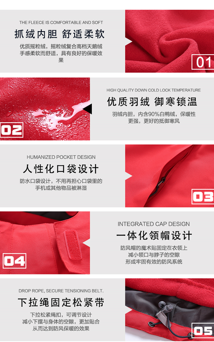 生產(chǎn)工藝:采用拉鏈壓膠防水工衣,可拆卸內(nèi)膽、袖口松緊魔術(shù)貼